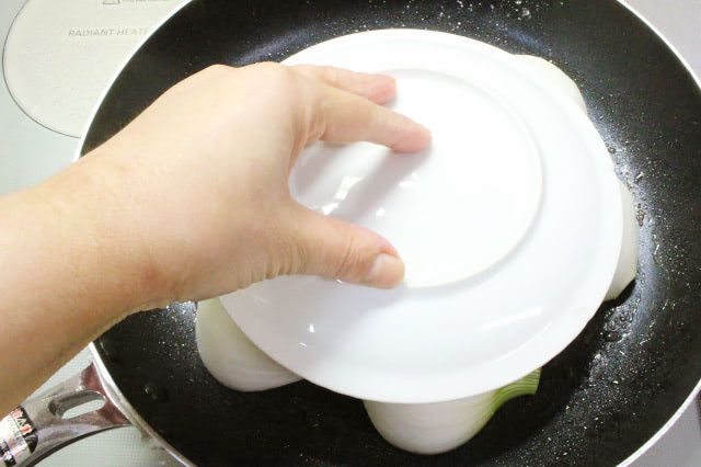 上の画像のように、お皿を乗せて押さえながら焼くと、一度に新玉ねぎ6個がフライパンに密着して焼き色が付きやすくなりますよ。今回は7分ほど焼きました。