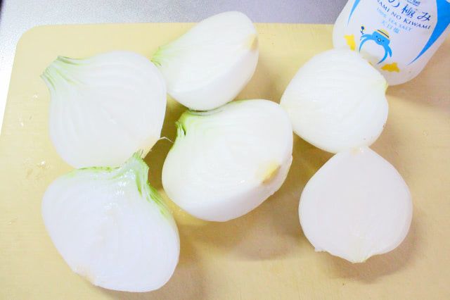 新玉ねぎがばらけないよう、芯を付けたまま切ります。具材の準備が出来るまで、塩を振って置いておきました。