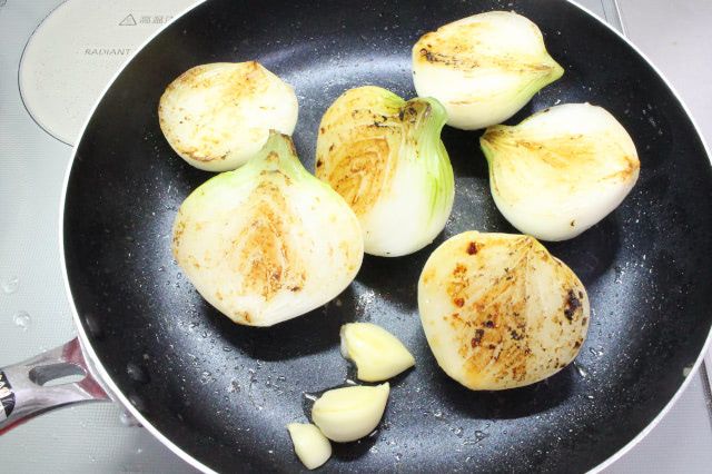 弱めの中火で7分ほど焼いて新玉ねぎをひっくり返すと、焼き色が付きました。にんにくの下にオリーブオイルを少し引き、香りが立つまで5分ほど炒めました。