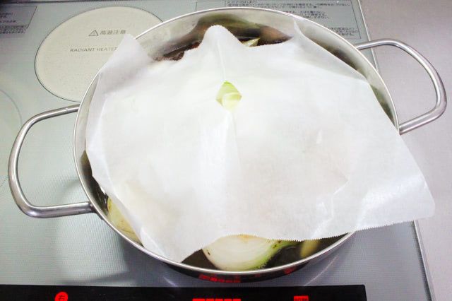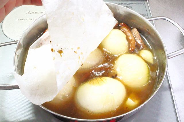 今回は玉ねぎをひっくり返し、もう一度落としブタをして、さらに15分ほど煮込みました。