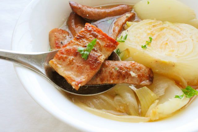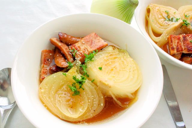 新玉ねぎとベーコン&ソーセージを煮込むだけ!春の甘味を感じるポトフ