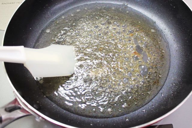 フライパンに付いた旨味をこそげ取りながら、白ワインの酸味が飛ぶようにしっかりと煮詰めます。3分ほど煮詰めると1/3くらいの量に減りました。