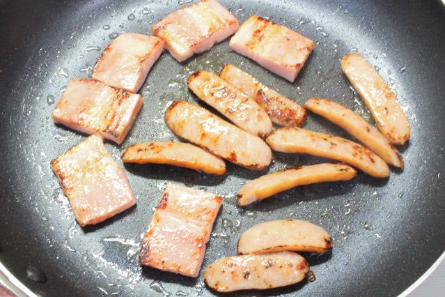 4. フライパンにオリーブオイルを極少量引き、中火で熱します。2のベーコンとソーセージを入れ、焼き色が付くまで焼きます。