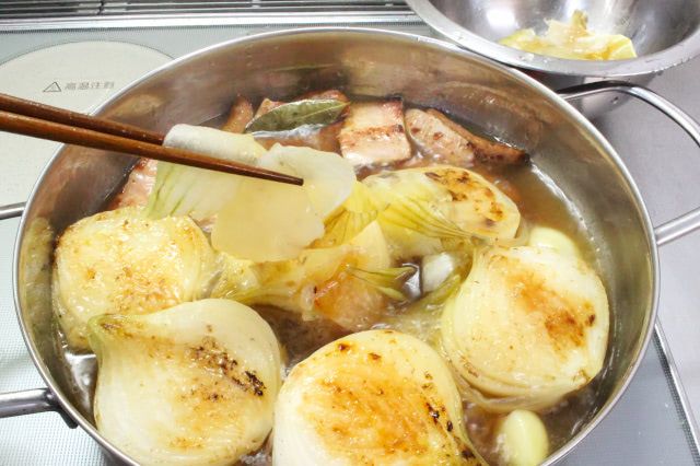 皮は20分くらいで引き上げるとのことなので、筆者は15分煮た段階で取り除きました。新玉ねぎも火が入り、とろんとやわらかくなっているようです♪