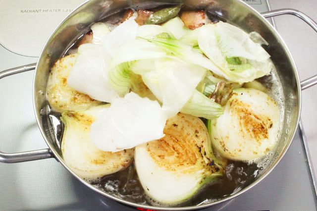 8. 鍋に水を加えてひと煮立ちさせ、1の玉ねぎの皮とローリエを乗せます。落としブタをし、30~40分煮込みます。