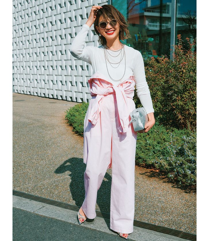 メンズっぽくてハードルが高い「つなぎ」は淡いピンクを選択するのが正解。さらにシースルートップスとネックレス盛りで媚びない甘さを。新しい自分が発見できて、多幸感あるコーデに。
