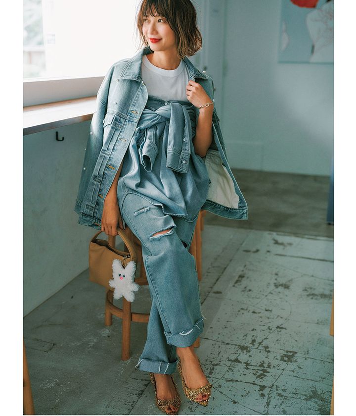 誰でも持っているデニムだからこそ、目を引くトレンドアイテムでこなれ感を出すのが肝。新鮮さがあることと、女っぽいポイントをどこかに作ることを意識しています。