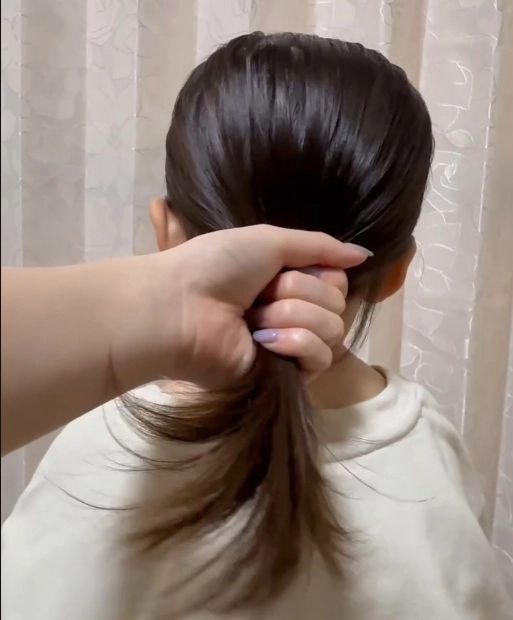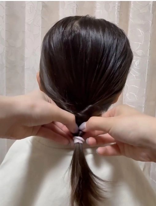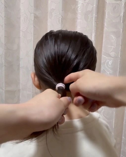 全体の髪の毛をひとつにまとめ、低い位置で結びます。