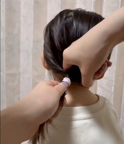 中央よりちょっと右寄りの髪の毛に穴をあけて毛束を通します。