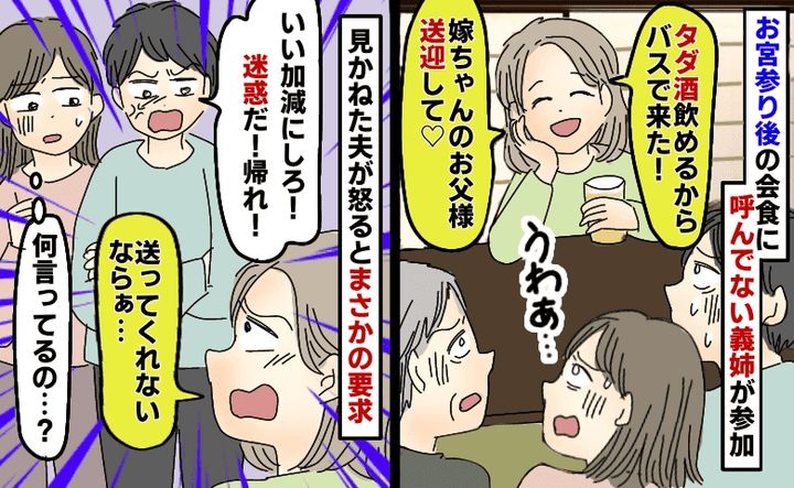 「タダ酒やったー!送迎よろしく♡」お宮参り後の会食に義姉が飛び入り参加…夫が追い出そうとすると