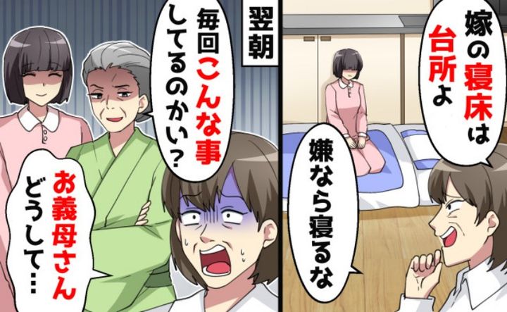 義母は「証拠の動画も音声も、録れないようにしてやる!」と私のスマホを取り上げ、私の布団を台所に投げ捨てました。そして、「嫁の寝床は台所よ! 嫌なら寝るな!」「明日は4時起きで料理と掃除、洗濯全部やるんだよ! 3時間後に起こしにくるからな」と言い捨てます。