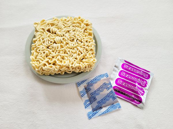 中身はこんな感じ。作り方は、鍋にお湯400mlを沸騰させ、麺を入れて、ほぐしながら4分程ゆでます。火を止め、粉末スープと調味油を加えてよく混ぜたら完成。