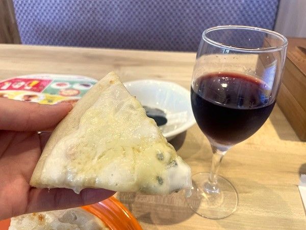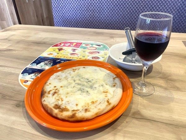筆者のおすすめは「ピッツァ クワトロフォルマッジ」(539円)と「グラスワイン」(242円)の組み合わせ。ゴルゴンゾーラチーズなど4種類のチーズとはちみつが絶妙なピザは直径約20cmで1人でも楽しめる大きさです。しっかりお腹を満たしつつ、アルコールも楽しめるお得な組み合わせです。