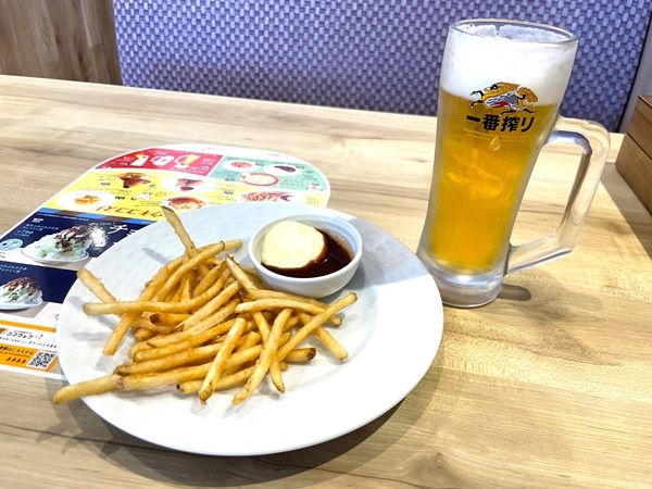 生ビールは中サイズなので割とたっぷりで飲みごたえがあります。カリカリポテトはソースをバーベキュー&マヨとケチャップ&マヨかの2種類から選べました。細くてカリカリの香ばしいポテトと濃厚なソースは生ビールによく合います。ちょいのみと言いつつ、生ビールのボリュームでほどよくほろ酔いになれそう。