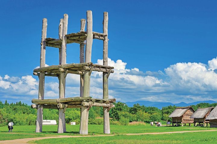 「特別史跡 三内丸山遺跡(とくべつしせき さんないまるやまいせき)」は、1992年からの発掘調査で姿を現した、縄文時代前期から中期(約5900~4200年前)の日本最大級の縄文集落遺跡。歴史ロマンあふれるムラの跡は今も発掘中。写真は今から4000年以上もの前の大型掘立柱建物の復元です。