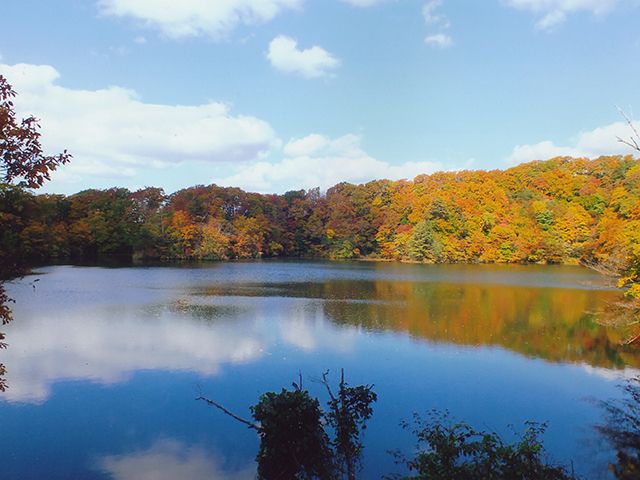 十二湖を代表する「青池」は透明度が深さ約9mの湖底まであり、神秘的な群青色の水中に枯れたブナを見ることができます。森の物産館キョロロから約1時間の散策コースが設けられていて、10月中旬~下旬にはブナの自然林や湖畔の樹林が紅葉する絶景が楽しめます。
