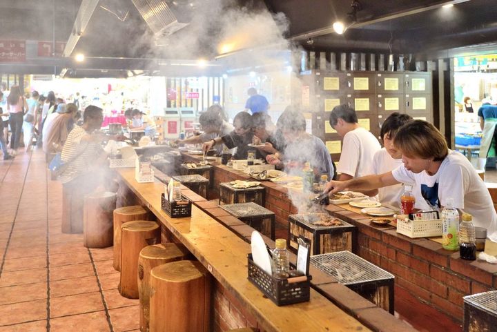 「八食センター」で必ず楽しみたいのが、市場棟1階にある「七厘村(しちりんむら)」の炭火焼き体験! 市場で好きな魚介類や肉を購入し、その食材を七厘で焼いて食べることができる、おいしくて楽しい人気店です。活気に満ちた店内には、昼間からお酒などのドリンク片手に炭火焼きを楽しむ人であふれています。