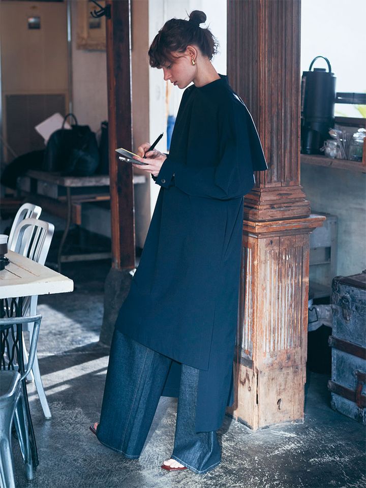 【STYLING POINT】冷静な雰囲気をかもし出すネイビーで統一して、知的なデニムスタイルを表現。シャツワンピからのぞかせる程度に、デニムを少量づかいにとどめると、さらにきちんと感がアップ。