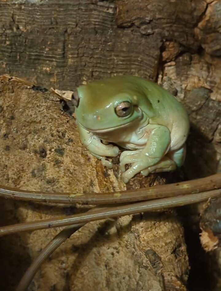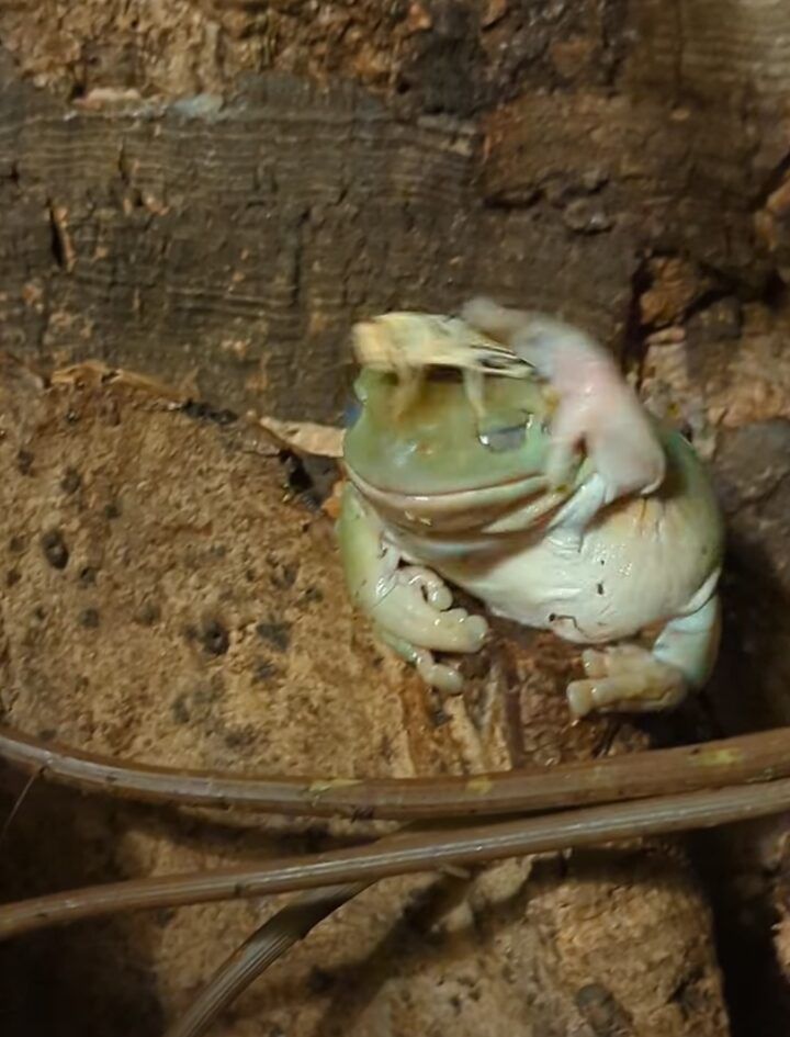カメラに映っているのは、撮影者さんが飼育しているアマガエルの仲間。 その頭の上には、ちょこんとイナゴが乗っています!