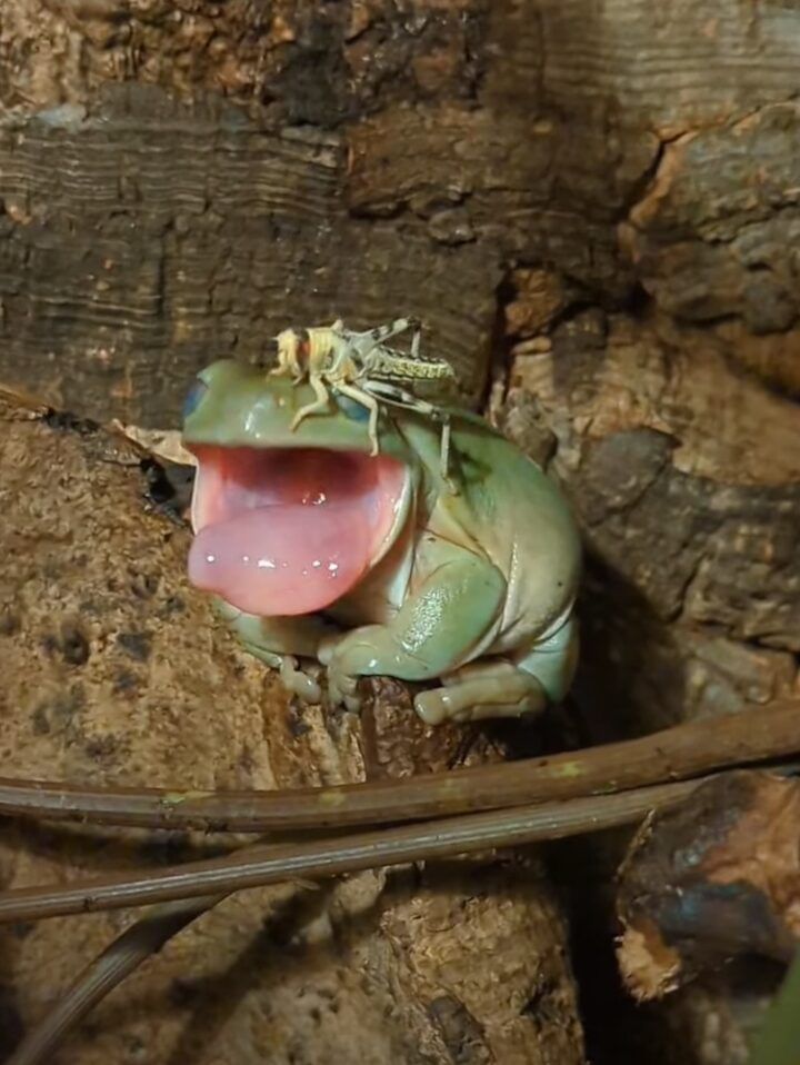 カエルの頭の上にはイナゴの姿が。 このイナゴを、カエルは長い舌で捕まえるのかとてっきり思われたのですが、思わぬ行動に出ました!!