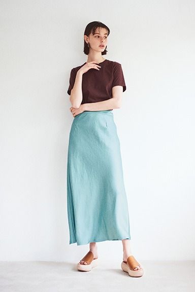 やわらかさを保ちながらも締まって見えるダークなチョコブラウン。いたってシンプルな組み合わせでも配色を変えるだけで今っぽく。サテンとキレイ色のおかげでTシャツ姿もクラスアップ。