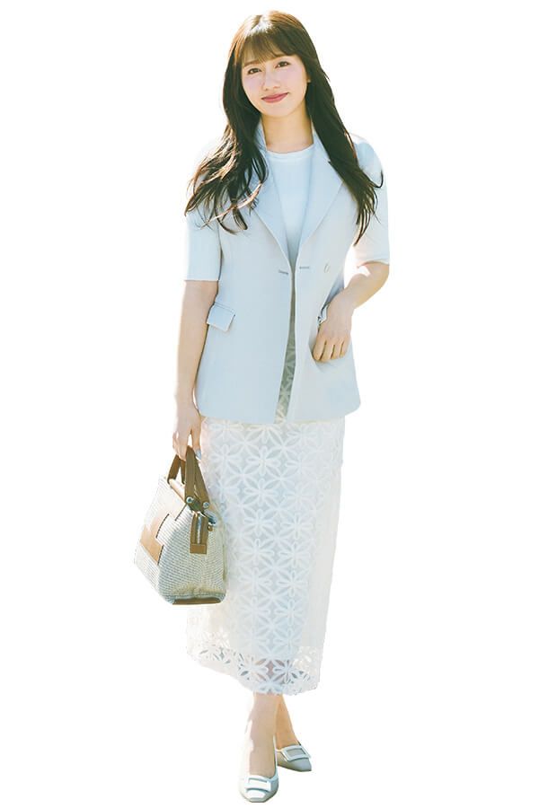 「ジレはIラインを作れる長め丈を選ぶのが正解。ワントーンで合わせたレーススカートは大柄のもので華やかに」