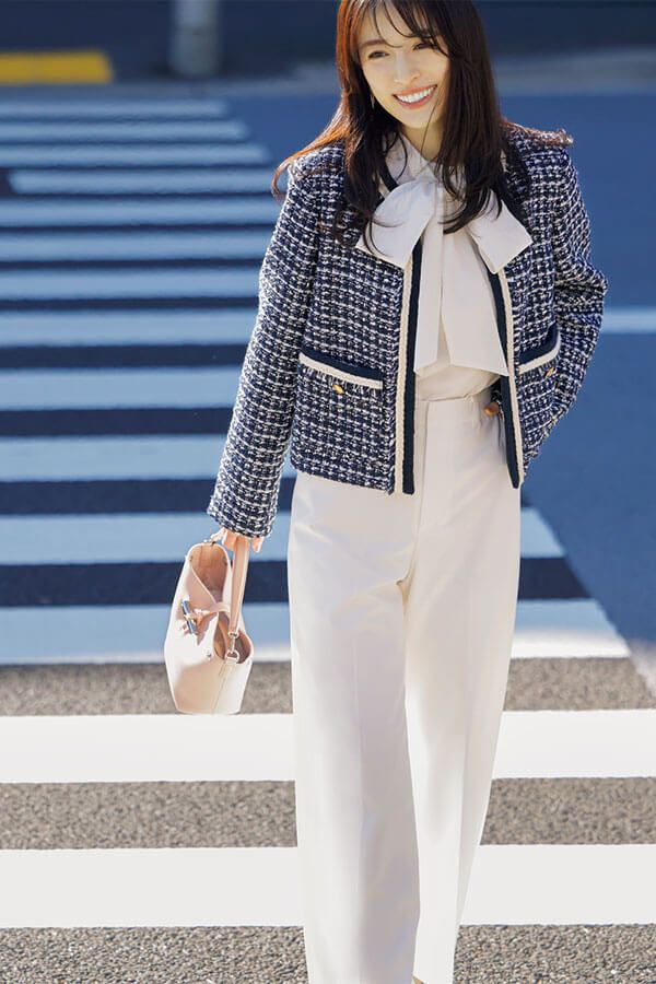 ジャケットを令嬢気分なツイード&ノーカラーにすることで、白パンツ姿がコンサバに転ばず百花系に。ブラウスのボウタイで甘さもひとさじ♡