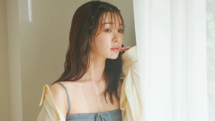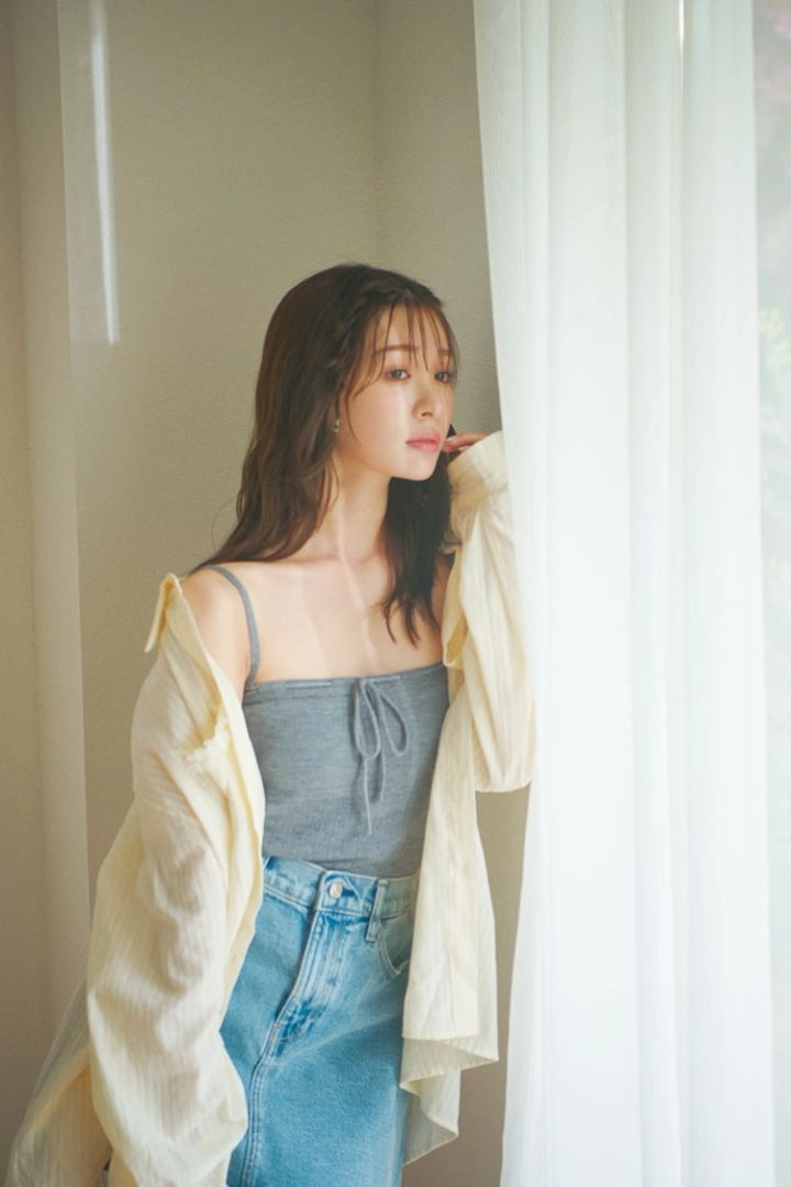 イエローシャツ 9,230円/イリゴ、グレーキャミソール 9,020円/キシニング(ともにHANA KOREA)デニムミニスカート 17,600円/カルバン・クライン