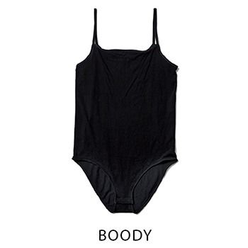 黒ボディスーツ/BOODY(ジョリコエンタープライズ日本支店) とろみをそなえたしなやかな肌ざわり。ソフトなカーブを描く首元や細ストラップなど体のラインを美しく見せるこだわりのシルエット。「インナーのひびきやもたつきが気になりやすいコンパクトなトップスには、ボディスーツという選択を。やや難易度が高い印象があるかもしれませんが、一度使うと手放せなくなるほど便利です」(船戸さん)