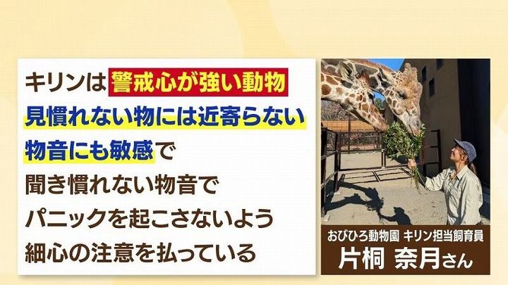 「キリンは野生下では肉食の動物から身を守るということがあり、嗅覚とか聴覚、視覚すべてにおいて能力の高い動物。あと理由の1つに頑固な一面がある」