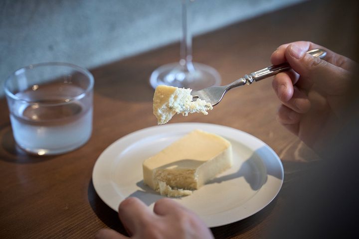 ホワイトチョコの程よい甘さのなかに、クリームチーズの酸味がぎゅっと凝縮された「ホワイトチョコのチーズケーキ」。苦いコーヒーと少しずつ食べ進めるのが、至福のときです。口に入れるとすっと溶ける、なめらかな食感も楽しみながらいただきます。