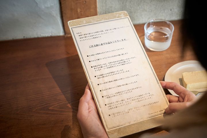 扉を開ける前からすでに、静かにひとり時間を過ごせそうな落ち着いた雰囲気。入り口には、大声での会話を控えること、PCでの作業を控えること、過度な写真撮影を控えることなど、心地よく過ごせるための決まりごとが書かれた紙が貼り出されています。