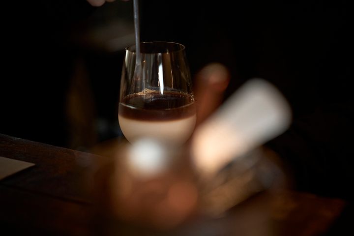 ミルクとコーヒーが、きれいな2層になって注がれます。同じ液体なのに、混ざらないのが不思議。吉村さんに聞いてみると、ミルクよりコーヒーのほうが軽いことを利用しているそう。とはいえ両方が適切に冷えていないと混ざってしまい、こうもくっきりと2層にはならないのだとか。注ぎ方にもコツがあるのだそうです。