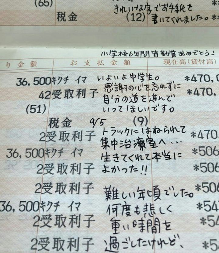 毎年長男の誕生日に1日100円、1年分の36500円を入金し、通帳にメッセージを書いていたというきくちさん。20歳まで続けると決めた貯金もついに最後の入金を迎えたそう。自由研究で褒められたことや交通事故に遭い集中治療室へ運ばれたことなど、そのメッセージを読むと息子さんがいかに愛されて育ったのかを感じることができますね。反抗期は辛かったと振り返るきくちさんですが、きっとそれもいい思い出だと息子さんと笑える日が来るのではないでしょうか。