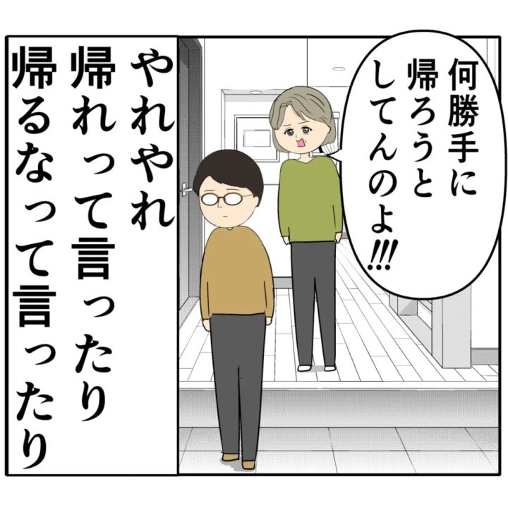 義母の呼びかけをスルーして玄関に行き靴を履いて帰ろうとするめが根さんに「何勝手に帰ろうとしてんのよ!!!」と呼び止める義母。しかしめが根さんは「やれやれ。帰れって言ったり帰るなって言ったり・・」と呟きながら義母の言葉を聞き流し玄関を出ていきました。