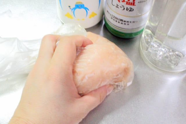 2. ポリ袋に鶏肉、塩、しょうゆ、酒を入れて袋の上からよく揉みます。