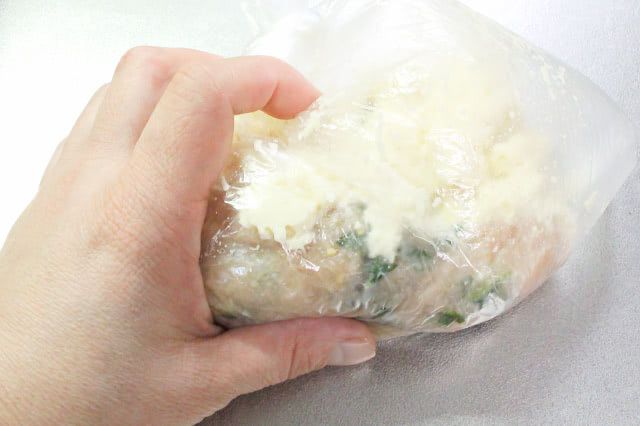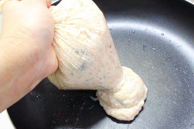 ポリ袋の先端を少し切って絞り出すと、手を汚さず、スムーズに肉だねを取り出せますよ。