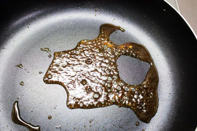 6. 5のフライパンにしょうゆ、酒、みりん、砂糖を入れて中火で煮詰めます。