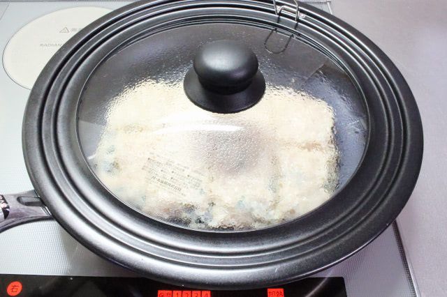 底面に焼き色が付くまで、今回は弱めの中火で6分ほど蒸し焼きにしました。