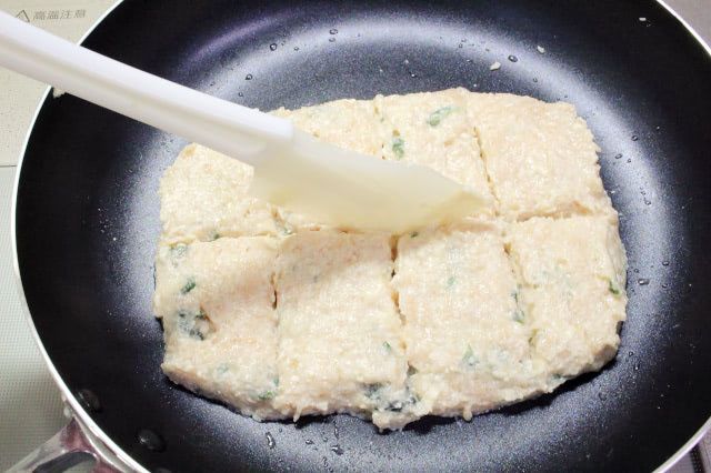 動画では四角い卵焼き器を使っていました。今回は小さめのフライパンに、肉だねを四角く広げて焼くことに。筋を入れておくと、出来上がった後に切り分けやすくなります。