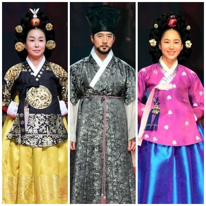 時代劇『オクニョ』で文定王后を演じたキム・ミスク(左)、尹元衡に扮したチョン・ジュノ(中央)、鄭蘭貞を演じたパク・チュミ(右)