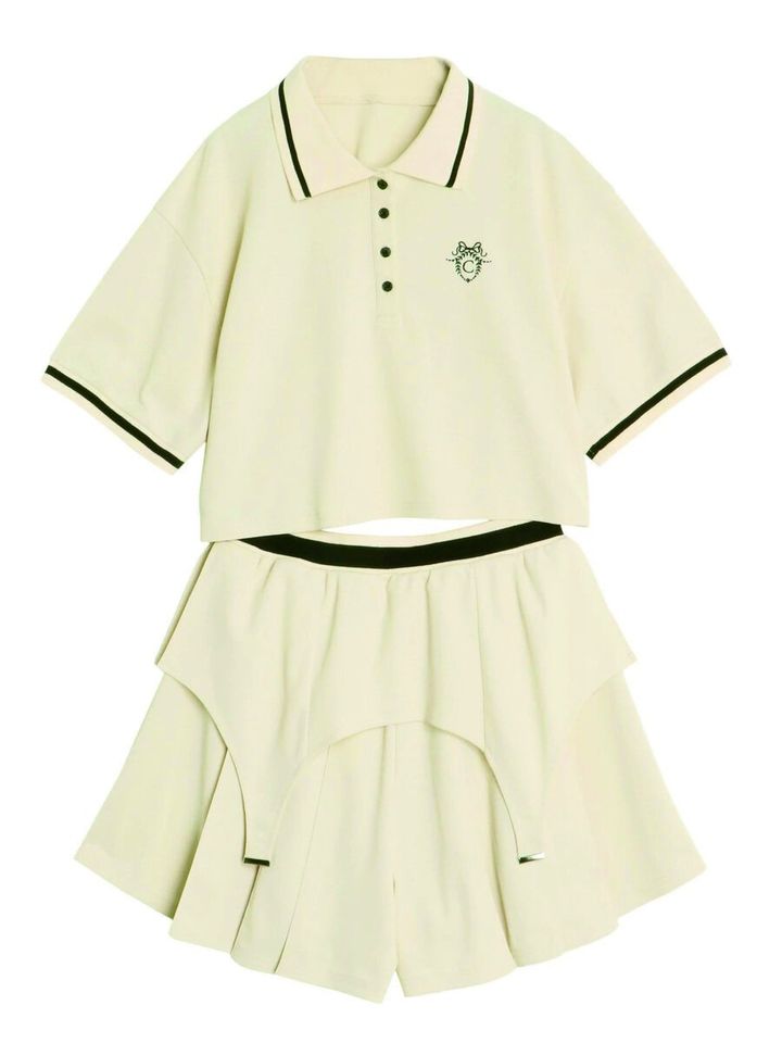 クロップト丈のポロシャツとタックキュロットのセットアップ。キュロットは、スカートのような見え方をする仕様に仕上げているので、スポ