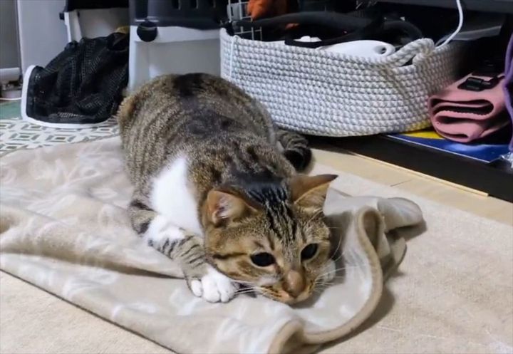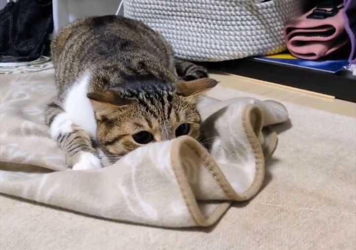 毛布に隠れてるつもり?猫じゃらしに飛びかかるネコの前後に動きが話題に「ちゃんと隠れ直すのかわいすぎ」