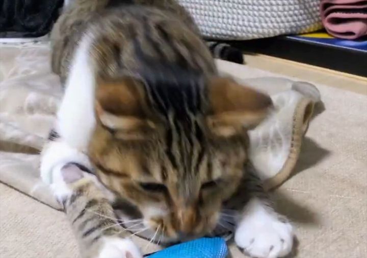 そんなテトちゃんの目の前に、飼い主さんが猫じゃらしを置くと・・・