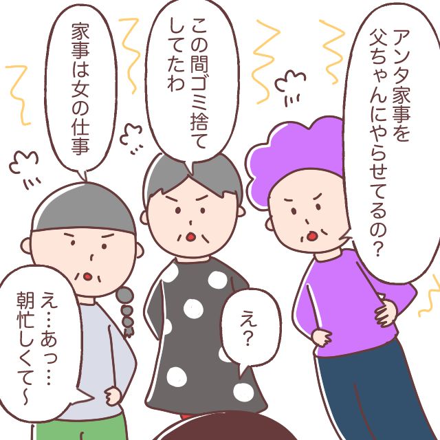 その後で、「アンタ、家事を父ちゃんにやらせてるの?」と言われ「え?」とビックリ!すると、「この間ゴミ捨てしてたわ」「家事は女の仕事」と3人のおばあちゃんたちの攻撃に動揺してしまい、「え・・あっ・・朝忙しくて~」という私の言い訳も通じませんでした。