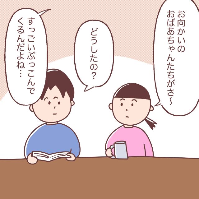 お向かいに住むおばあちゃんたちは、明るく気さくだけれど言いたいことをズバッというタイプ。娘を保育園に迎えに行けば、「旦那の稼ぎが悪いのか?」と言われたり、年齢を聞かれて4X歳と答えれば「悠長なこと言ってないで早く2人目を!」とぶっこまれたり・・。慌てて逃げ帰ったものの、少しずつストレスがたまってしまい、夫に相談することに。