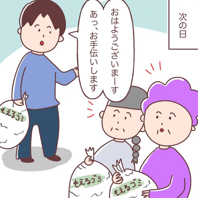 ゴミ出しに言った夫が「おはようございまーす。あっ、お手伝いします」と2人のおばあちゃんに挨拶して声を掛けると、