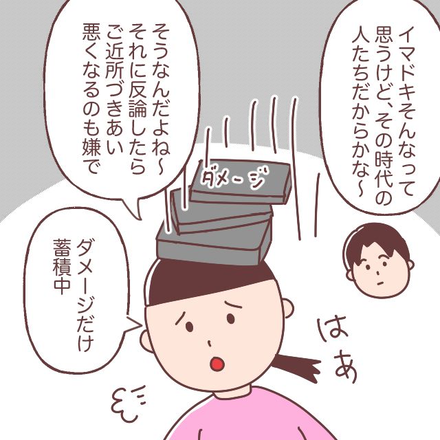 すると、「イマドキそんなって思うけど、その時代の人たちだからかな~」と答える夫に、「はぁ~、そうなんだよね~、それに、反論したらご近所づきあい悪くなるのも嫌で・・ダメージだけ蓄積中」とため息をつきながら答えました。