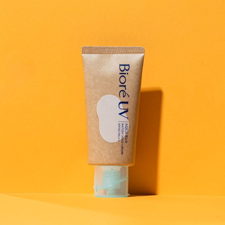 肌になじむ気持ち良いつけ心地のノンケミカル処方(紫外線吸収剤フリー)の日焼け止め。ベタつきやきしみ感のないもっちりとした水感クリームが肌に伸びると、厚みのある膜が形成されて夕方まで肌のうるおいを感じられます。石けんで落とせたり、アルコールフリーだったりと、敏感な方でも使いやすい処方。SPF50 PA+++ ビオレUV アクアリッチ ウォータリーホールドクリーム 50g 1,430円(編集部調べ)/花王