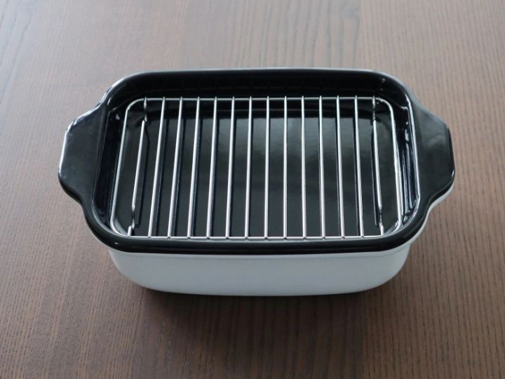 『富⼠ホーロー ⾓型天ぷら鍋』は、シンプルな⾓型ホーロー鍋に温度計付きなので、買い⾜したその⽇から揚げ物の温度の⾒極めが温度計にお任せできちゃいます。